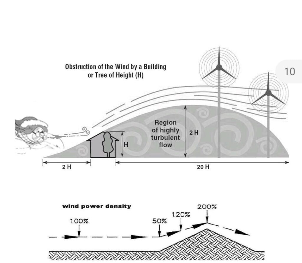 2. By turbina pozioma produkowała prąd, musi być posadowiona w miejscu gdzie wieją wiatry jednostajne, jednokierunkowe i nie porywcze. Muszą to być przestrzenie otwarte, bez sąsiadujących budynków, drzew, względem osi wirnika. Wszystkie te przeszkody wypaczają swobodne przepływy wiatru.